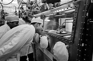 Apollo 15 astronaut David Scott examines the so-called Genesis Rock