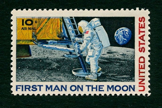 Commemoration of the landing of Apollo 11 on the Moon. The illustration is an artist’s impression of Neil Armstrong talking his ‘one small step’ onto the surface. In reality, the Earth was not low on the horizon as shown here but much closer to the zenith because they landed near the centre of the Moon’s visible face. This stamp was intended for airmail postage, hence the prefix ‘A’ to the Stanley Gibbons catalogue number.