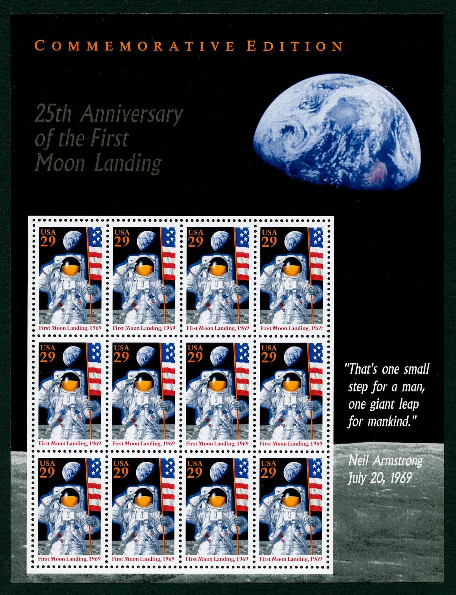 A souvenir sheet commemorating the 25th anniversary of Apollo 11, containing a dozen 29c stamps surrounded by the famous Apollo 8 picture of the Earth rising above the Moon. The sheet was issued on 1994 July 20, the same day as USA 2921. Stamps from this sheet can be obtained individually but do not have a separate number in the Stanley Gibbons catalogue.