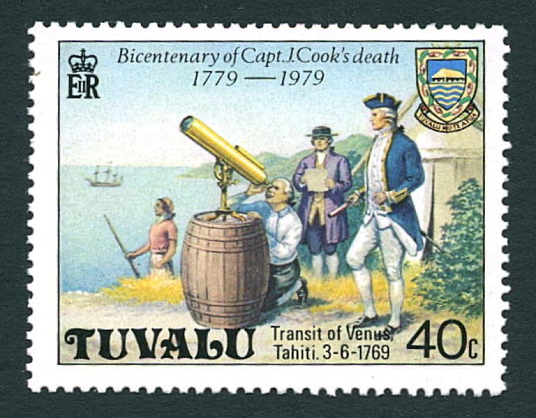 A modern-day artist’s impression of the observation of the 1769 transit of Venus from Tahiti by Cook and the astronomer Charles Green on a stamp from the Pacific islands of Tuvalu issued in 1979, the bicentenary of Cook’s death. Green is presumably intended to be the kneeling figure looking through the telescope, which was a 4-inch Gregorian-style reflector made by James Short, magnifying 140 times. It is screwed to the top of a ship’s keg filled with wet sand, providing a simple but stable mounting. In reality, Cook and Green observed simultaneously through identical telescopes while Daniel Solander, the naturalist, here shown taking notes, used a third telescope of higher magnification.