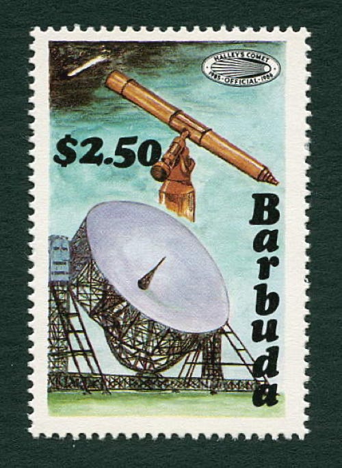 The Caribbean island of Barbuda showed the Jodrell Bank dish on one of its Halley’s Comet stamps issued in 1986. The contrast with the traditional refracting telescope in the background may have been intended to convey the advances in astronomy since the previous appearance of Halley’s Comet in 1910.