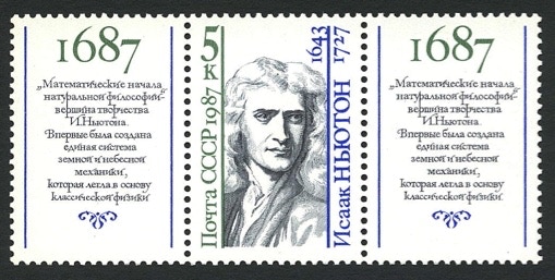 Russia commemorated the 350th anniversary of the Principia with this stamp, part of a set of three honouring famous scientists. The drawing of Newton is based on Godfrey Kneller’s 1689 portrait. Attached to the stamp are two identical labels, the wording on which says: ‘Mathematical Principles of Natural Philosophy, the greatest work of I. Newton. For the first time a unified system of terrestrial and celestial mechanics was constructed, which became a basis of classical physics.’