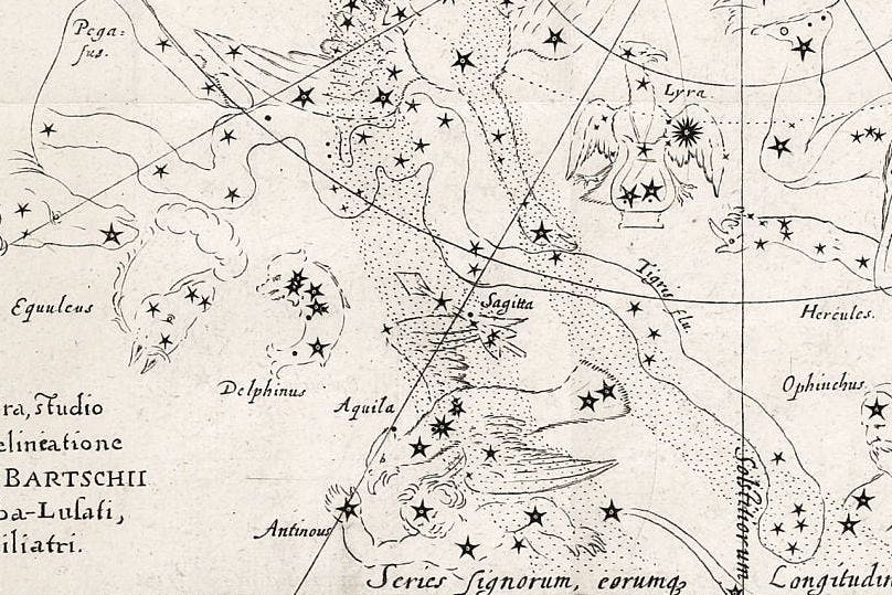 Another celestial river that, like Jordanis, did not flow for long. Starting at the neck of Pegasus, it meandered between Cygnus and Aquila, ending in the Milky way next to the right arm of Ophiuchus.