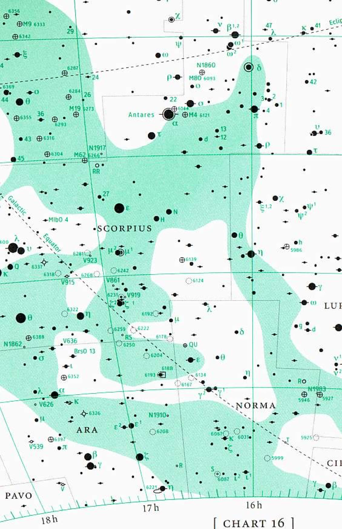 A chart from a modern star atlas showing northern Norma and part of Scorpius. When Lacaille invented Norma, he envisaged it extending northwards into Scorpius. Since then the top of the ruler has been cut off, and the stars he designated Alpha and Beta Normae are now known as N and H Scorpii. They can be seen here above right of the name Scorpius.