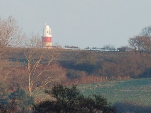 The above picture was taken on 2006 December 9 from near the supposed UFO ‘landing site’ by Tony Nelson of Wickham Market, who kindly sent it to me for use on this website. The lighthouse tower is 30m high, and the intervening ridge has a maximum height of 19m (OS spot height). Lower down the tower were red and green sector lights but these could not be seen from the forest. For more about the notch on the ridge through which the top of the lighthouse was visible, see Image 5 below.